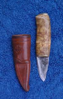 Pieni taskupuukko oli saanut perisuomalaisen nimen ja sillä nimellä se nykyisin tunnetaan. Sitä on tehty kymmenillä kursseillani ihmisten iloksi ja hyödyksi varsinaisen kurssityön lomassa. Puukon terän muotoilu on hiukan erikoinen. Terän teroitus on tehty pitkälti suoraksi ja kärki vasta kääntyy hiukan ylöspäin. Tällä teroituksella Naperollakin pystyy hyvin vuolemaan, kuten pitkäteräisen puukon terän tyvellä tehdään. Puukon pää on melko lyhyt, mutta kolme sormea mahtuu kahvan päälle ja pikkusormi tukee kapinetta kahvan päästä sillä työskennellessä. Kokeilin jo vuosia sitten saamani taskupuukkoa erävaelluksella Kevon kurussa ja on todettava, että muuta kapinetta ei tuolla reissulla kaivattukaan, sillä tällä pienellä puukolla tein retken kaikki työt erinomaisesti.