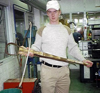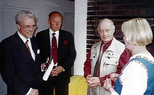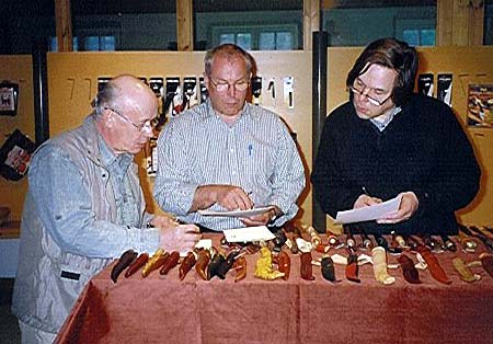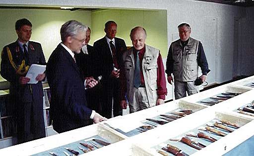 ![]() Uniikkipuukkojen vientinäyttelyn avajaiset Hampurissa 2.6.2001. Tohtori Arajärvi tutustumassa näyttelyyn Taisto Kuortin ja seuran sihteerin Seppo Mäkisen opastuksella |