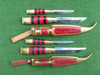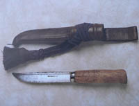 Pekanpään puukkoMatkaamme Torniosta muutamia "poronkusemia" pohjoiseen, ja olemme Pekanpään kylässä. Rajapaikkakuntana sinne kehittyi viime vuosisadan puolivälin jälkeen puukkoteollisuutta, jonka tuotteet levisivät sekä Ruotsiin että Suomeen. Puukko on helposti tunnistettavissa. Sen pää on valmistettu tuohesta, ja ylimpänä on soikion muotoinen pyöristetty messinkinuppi, joka mukautuu saumattomasti pyöreähkön pään muotoihin. Alahelana on ohut messinkihela terää vasten, joka tukee tuohisen pään kasausta. Terä on tyypillinen suoranomainen, jonka kärki on yläpuolelta hiukan viistetty. Tuppi on vahvistettu lestalla ja koristeltu nahkaan pakotetulla peilillä. Kuvan puukon on valmistanut viimeisenä tätä puukkoa tekevä Armas Hartikka, jonka nimikirjaimet koristavat tupen yläosaa.