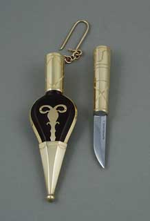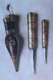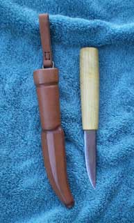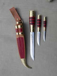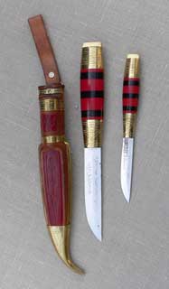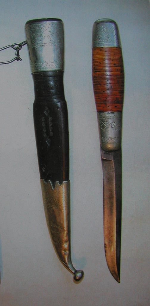 Tuohonkin aikaan mainetta pyrittiin hankkiman osoittamalla tehtyjä tuotteita silloisille hallitsijoille. Perimätieto kertoo, että Samuli Tuoriniemi valmisti kauniisti koristellun puukon tuppineen silloiselle perintöruhtinaalle. Puukko lähetettiin hyvin pakattuna Pietariin lahjana kuuluisalta suomalaiselta puukkosepältä. Olisi mielenkiintoista käydä penkomassa Eremitaasin varastoja, josko kyseinen puukko ilmaantuisi esille, tai sitten se on kadonnut historian hämärään. Asiassa kiinnostaa puukon tuppi, sillä yhtään tupellista yksilöä ei ole tiettävästi tallella. Tupen puukkoihin tehtiin itse, tai sitten joku alan osaaja, eli paikallinen suutari. Myöhemmin Pyhäjärvellä kursseja pitäessäni minua pyydettiin suunnittelemaan puukolle yksinkertainen tuppi, joka näkyy myös oheisessa kuvassa. Perimätiedot ovat hataria ja usein mielikuvituksen hämärän verhoamia. Kuitenkin Pyhäjärven museossa on puukko, joka on kotoisin Elias Lönnrotin veljenpojan pojan pojalta, eli Lehtori Lauri Lounelalta. Puukko oli tehty joko hänen isoisälleen Frans Lönnrotille tai isälleen Elias Lönnrotille, jotka olivat molemmat pappeina Ristijärvellä.